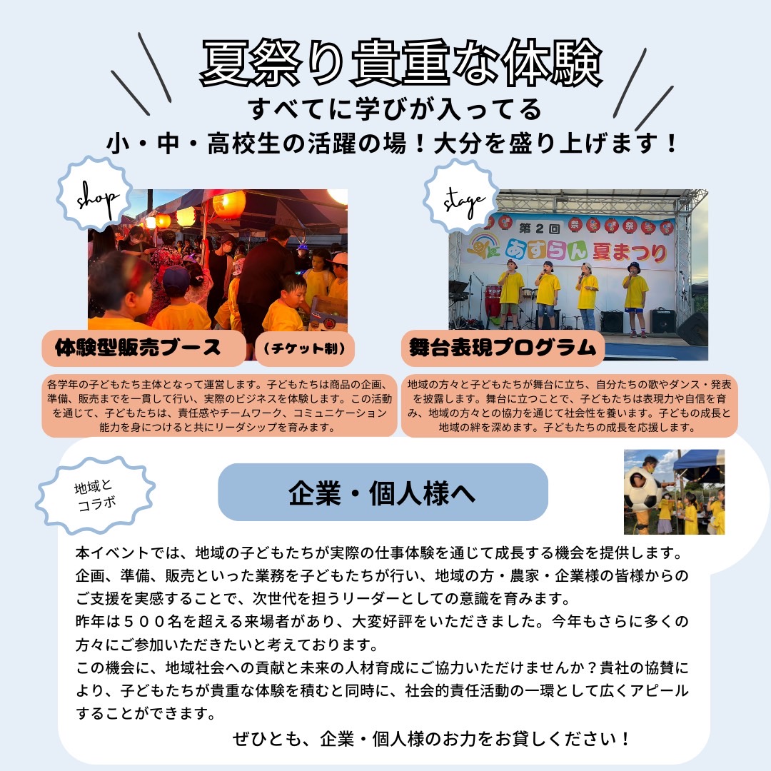 地域と共に創る『あすらん夏まつりwith地域』を今年もが8月31日(土)に開催される事が決定しました👏